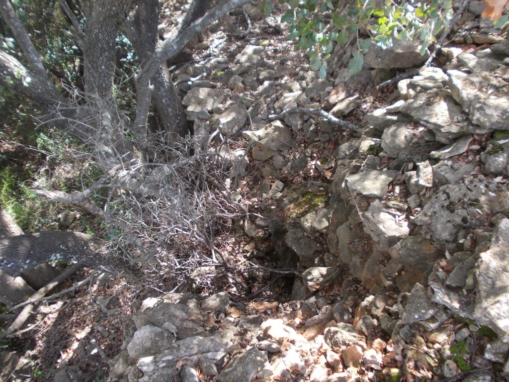 Immédiatement, nous tombons face à un mur en pierre sèche orienté Est-Ouest. Relativement massif, les pierres qui le constituent sont en majorité celles qui furent extraites de la parcelle de vigne. Ce mur sépare cette terre arable au Nord, d’une parcelle dont la roche calcaire affleure très rapidement, au Sud. Il est alors aisé de penser que cette dernière fut jadis dédiée aux bergers et chevriers.