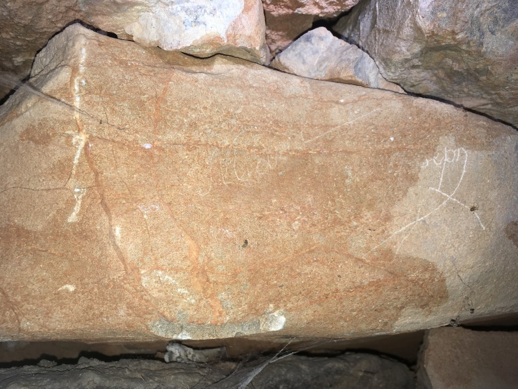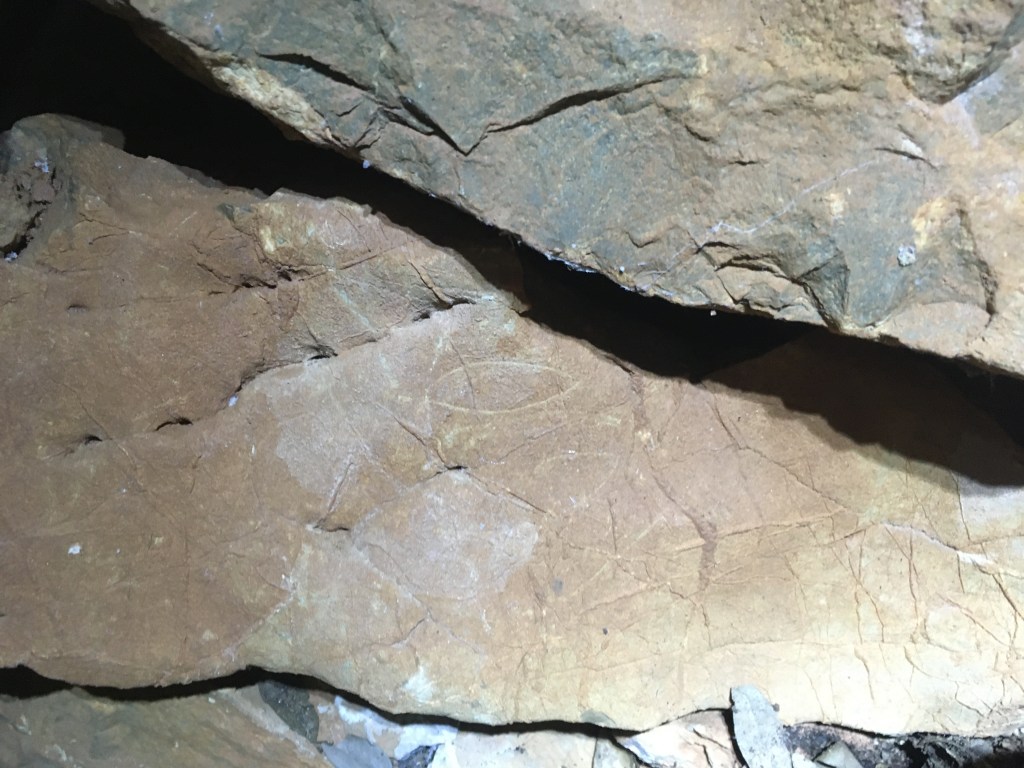 Et bingo, nous y découvrons cinq graffitis : « Maria » et « Joseph », « Gui… » (?), « J.M.E » et d’étranges formes ovales. Combien de personnes ont réalisé ces gravures (deux au minimum) ? Se connaissaient-elles ? L’ont-elles fait en même temps ? A quelle époque ? Tant de questions peuvent se poser…Nous pourrions tenter d’y répondre en se penchant sur les actes d’état civil des villages voisins. Tâche fastidieuse… Ou alors, laissons aller notre imagination.