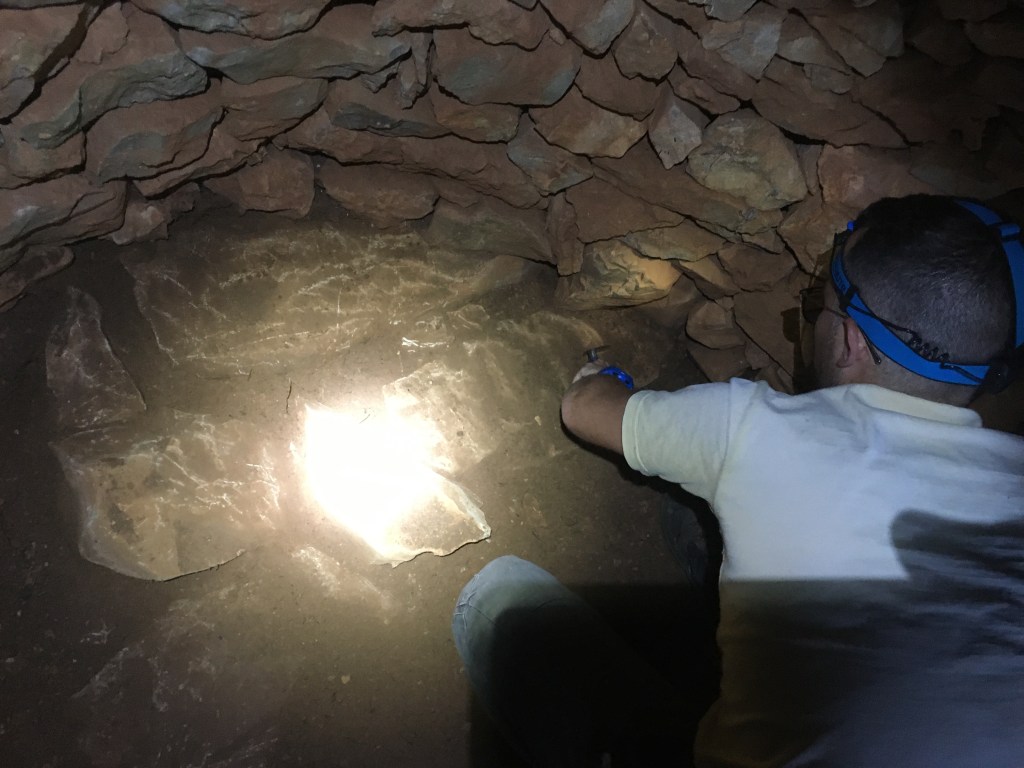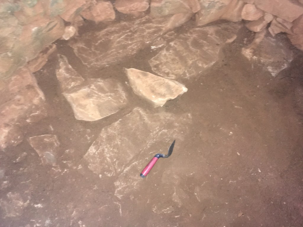 La surface est décaissée de moitié et de manière planimétrique à l’aide d’une petite pelle et d’une truelle d’archéologue. Les déblais sont entreposés à l’extérieur. Rapidement, des blocs relativement plats apparaissent. Au premier abord, nous pensons à une sorte de dallage. Mais à y regarder de plus près, nous arrivons à la conclusion que nous sommes en présence du substrat calcaire fragmenté.
